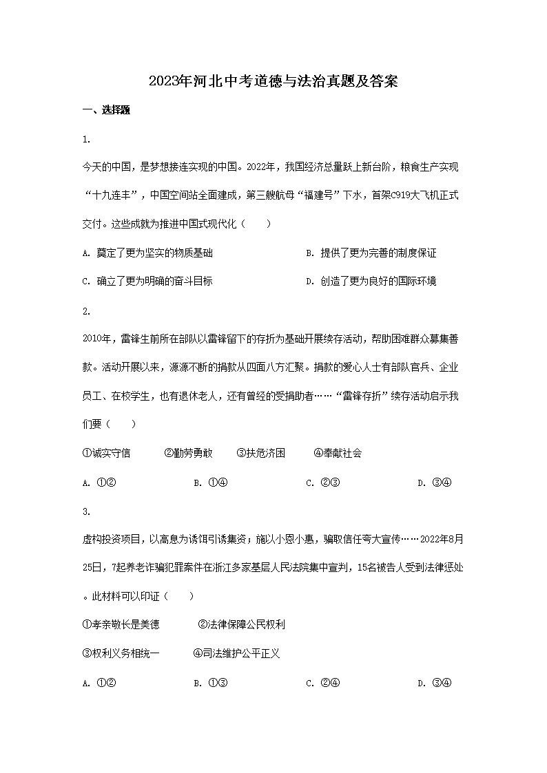 【文档预览】 文档大全网整理发布2023年河北中考道德与法治真题及答案(Word版),前五页预览如下: