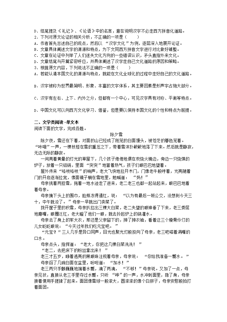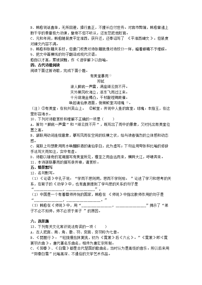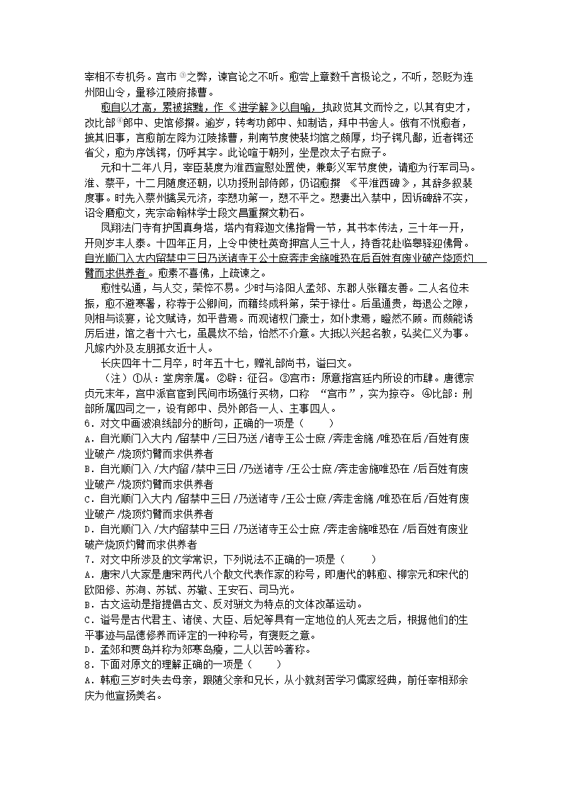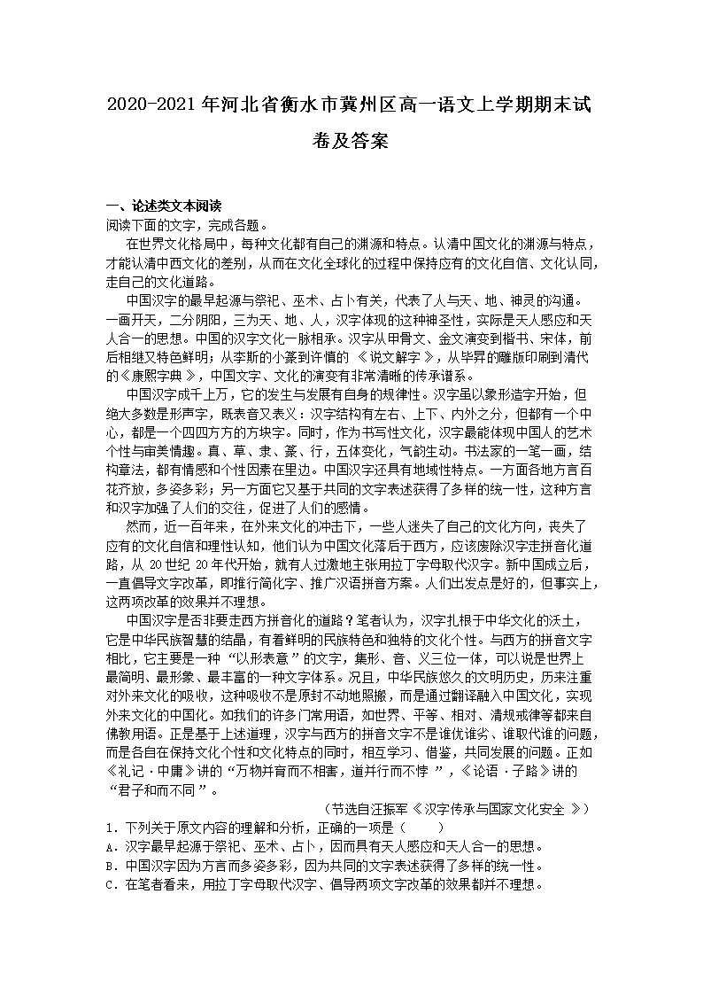 2020-2021年河北省衡水市冀州区高一语文上学期期末试卷及答案(Word版)09-15