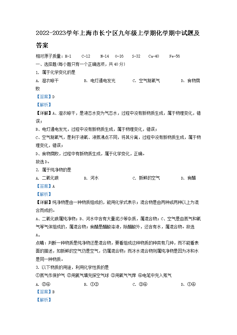 【文档预览】 文档大全网整理发布2022-2023学年上海市长宁区九年级上学期化学期中试题及答案(Word版),前五页预览如下: