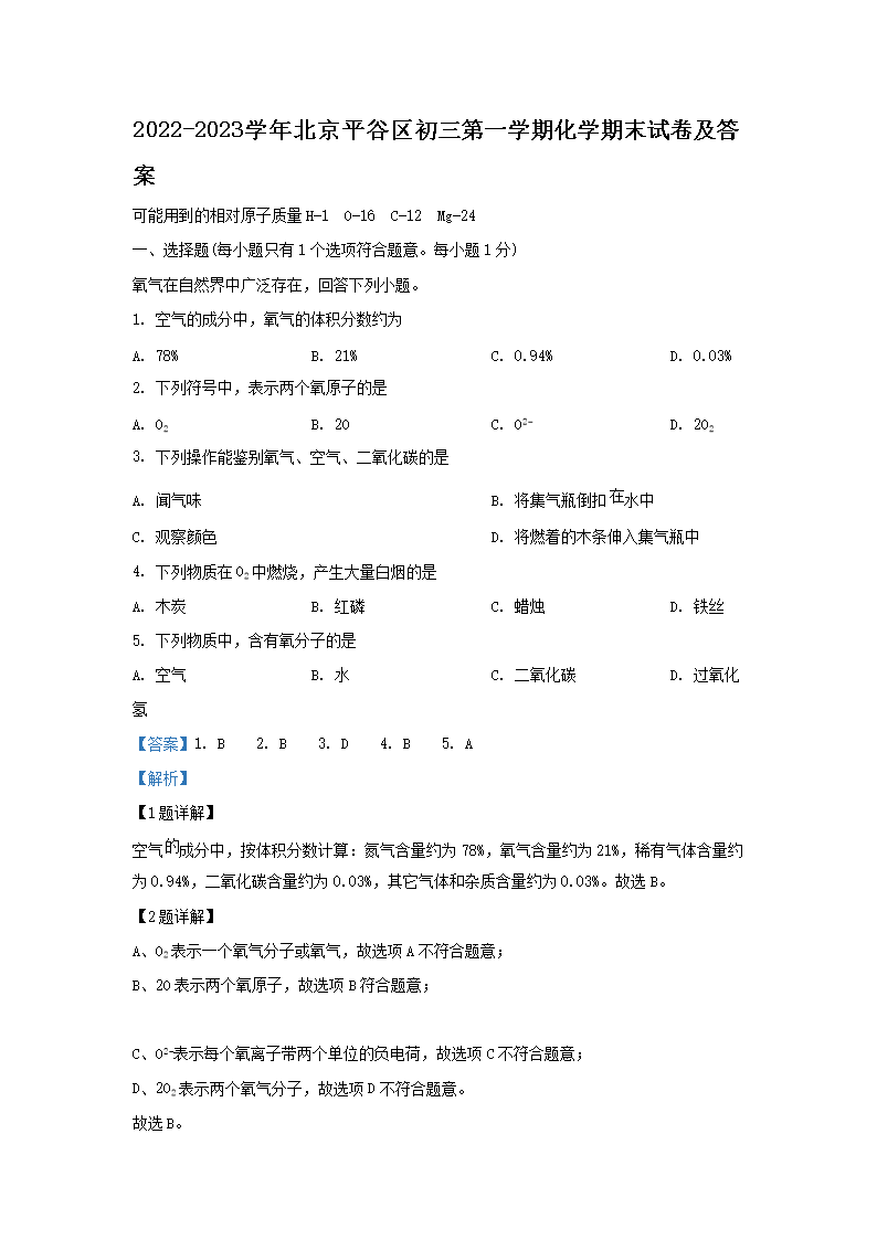 2022-2023学年北京平谷区初三第一学期化学期末试卷及答案(Word版)08-04