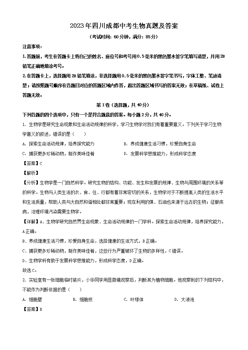 【文档预览】 文档大全网整理发布2023年四川成都中考生物真题及答案(Word版),前五页预览如下: