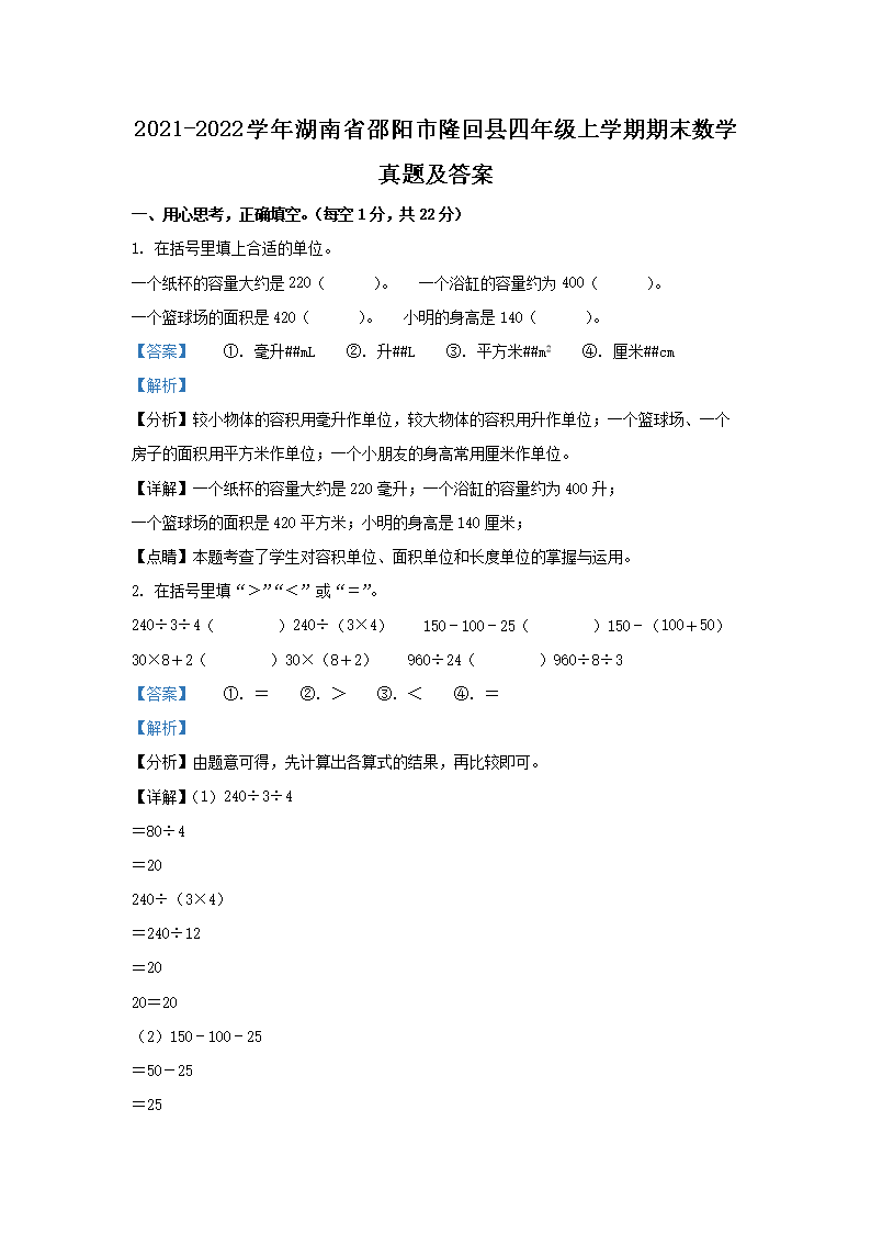 2021-2022学年湖南省邵阳市隆回县四年级上学期期末数学真题及答案(Word版)07-22