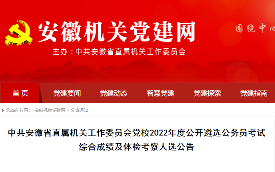 【#遴选# 导语】®文档大全网从安徽机关党建网了解到,2022年中共安徽省直属机关工作委员会党校遴选公务员考试综合成绩已公布,相关事宜如下: