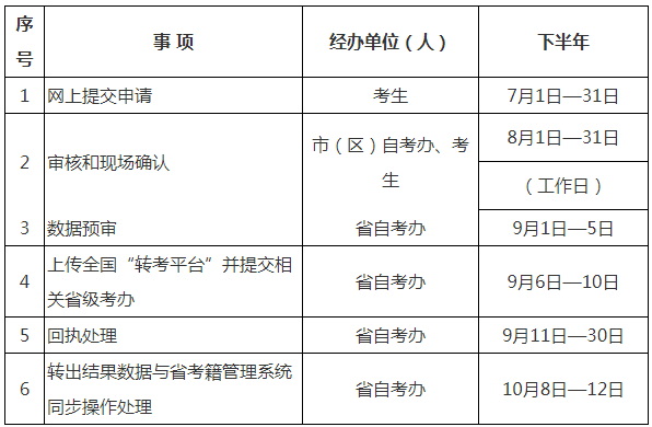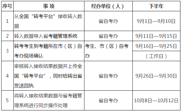 1.转入考生应及时关注转出省考生服务平台本人转考信息,转出成功后,在规定日期内,到我省考籍所在市(区)自考办办理转入确认手续。