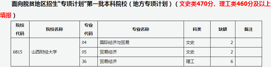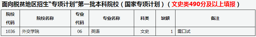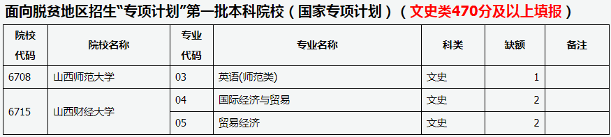 面向脱贫地区招生“专项计划”第一批本科院校限符合条件的考生填报,成绩需达到第一批本科最低控制线:文史类490分(部分院校文史类470分、理工类460分)。