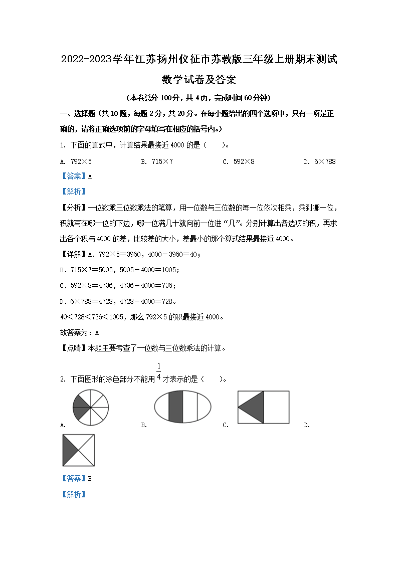 2022-2023学年江苏扬州仪征市苏教版三年级上册期末测试数学试卷及答案(Word版)07-18