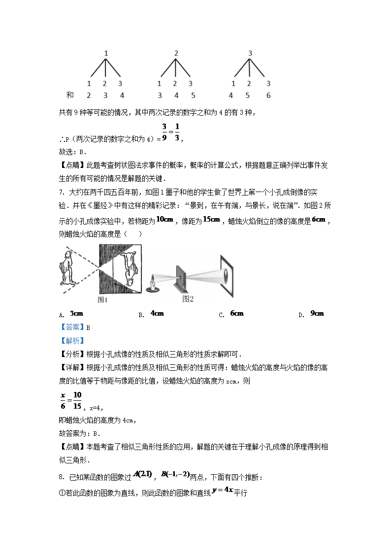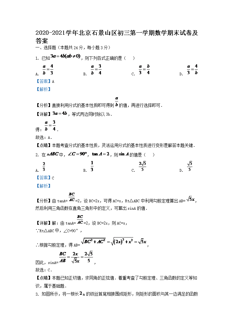 2020-2021学年北京石景山区初三第一学期数学期末试卷及答案(Word版)07-28