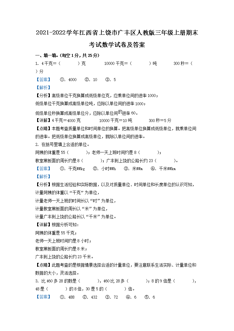 【文档预览】 文档大全网整理发布2021-2022学年江西省上饶市广丰区人教版三年级上册期末考试数学试卷及答案(Word版),前五页预览如下: