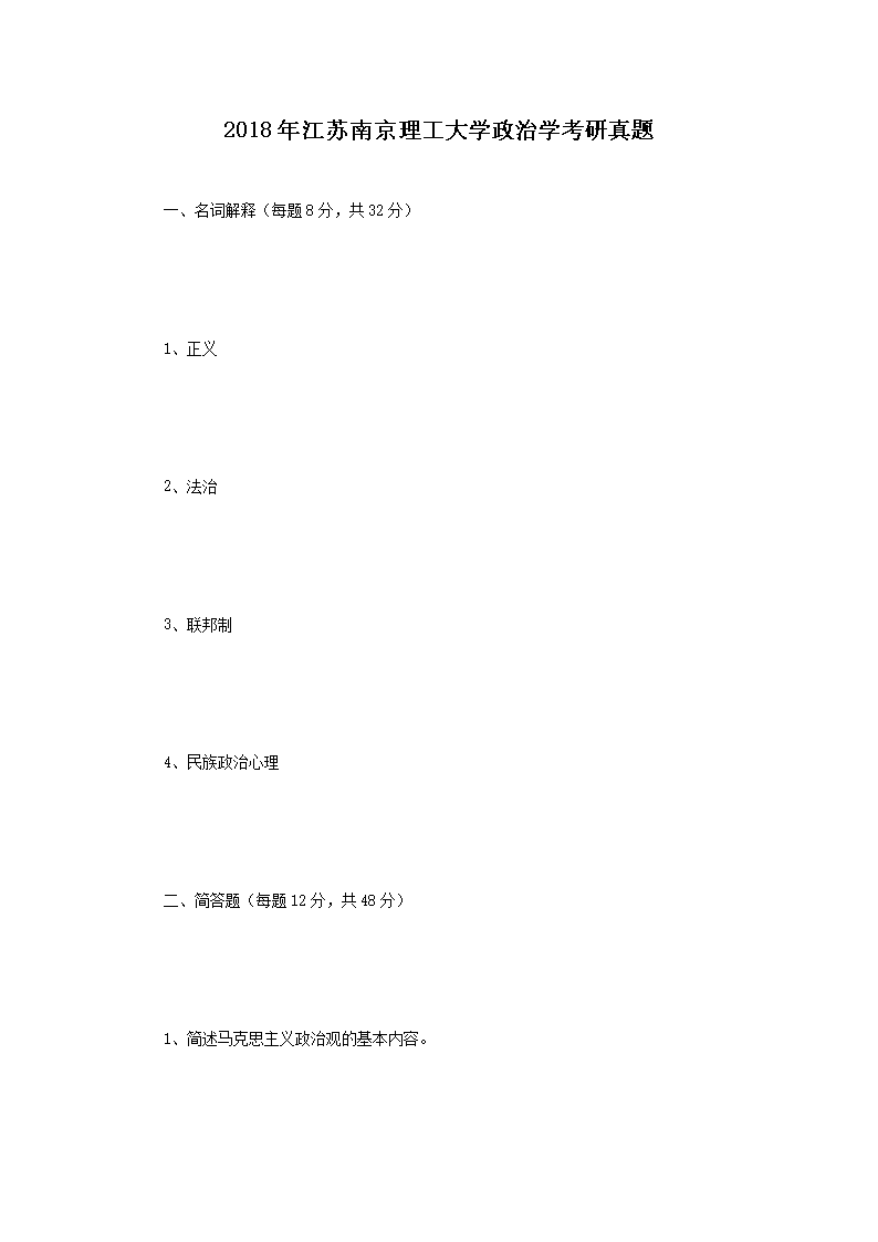 【文档预览】 文档大全网整理发布2018年江苏南京理工大学政治学考研真题(Word版),前五页预览如下: