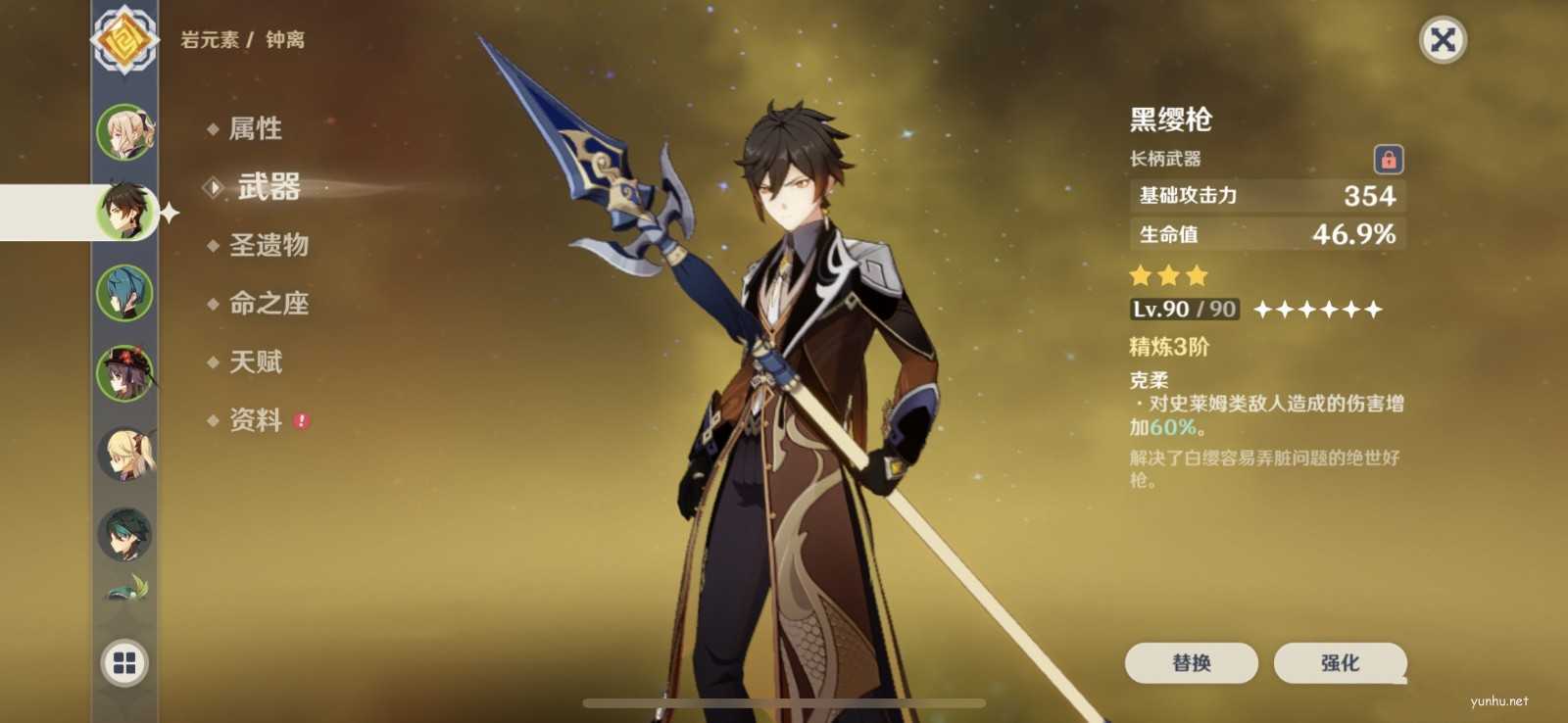 站场物理输出型武器绿枪或护魔,因为目前没有加物理的5星武器所以没太大意义,虽说钟离是六边型战士是个优点但也是个缺点。没有足够的银子我是不建议用钟离来打输出的,虽然伤害颇为不俗,但护盾机制关系护盾是必须常驻的但因为是物理,角色总生命值不会太高导致护盾也不会太厚,对付一些攻击力不高的还好说可一旦遇到一下破盾的怪的时候就极其难受。总结:圣遗物必须深造,武器为5星首选。