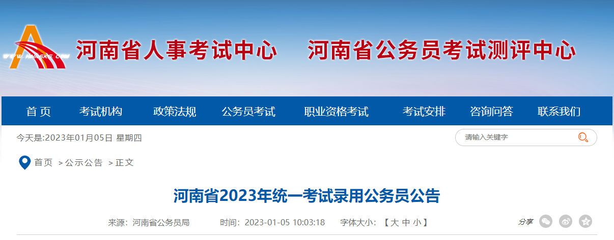 【#公务员考试# 导语】®文档大全网从河南人事考试网发布的《2023年河南省统一考试录用公务员公告》中获悉,2023年河南公务员报名确认及缴费时间:2023年1月20日9∶00至1月30日17∶00,具体安排详情如下: