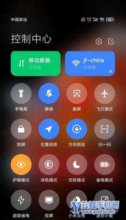 2、快捷键截屏:从手机屏幕顶部状态栏处下拉,呼出控制中心,点击【截屏】快捷功能图标即可。