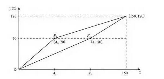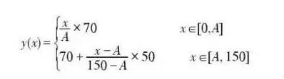 设某科目原始成绩合格分数线为A(0<150),若考生在该科目的原始成绩为x(0≤x≤150),则转换分y(x)(0≤y(x)≤120)的计算公式为:<150),若考生在该科目的原始成绩为x(0≤x≤150),则转换分y(x)(0≤y(x)≤120)的计算公式为: 举例来说,设两个科目的合格分数线分别为A1和A2,则转换分y(x)关于原始成绩x的函数图像如图所示: 通过上述线性转换,各科目的合格分数线均转换为70分,且转换不改变考生成绩的高低顺序。原始成绩低于合格分数线的考生,换算后的转换分在70分以下;原始成绩高于合格分数线的考生,换算后的转换分在70分以上。 7.信息来源