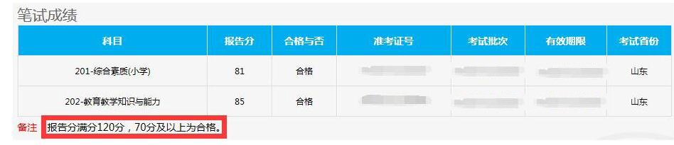 根据下图教师资格证笔试成绩示例,教师资格证报告分满分120分,70分及以上为合格。