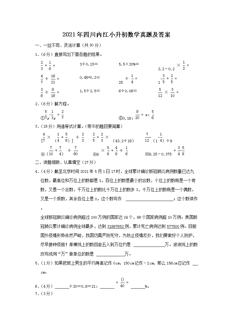 2021年四川内江小升初数学真题及答案(Word版)06-29