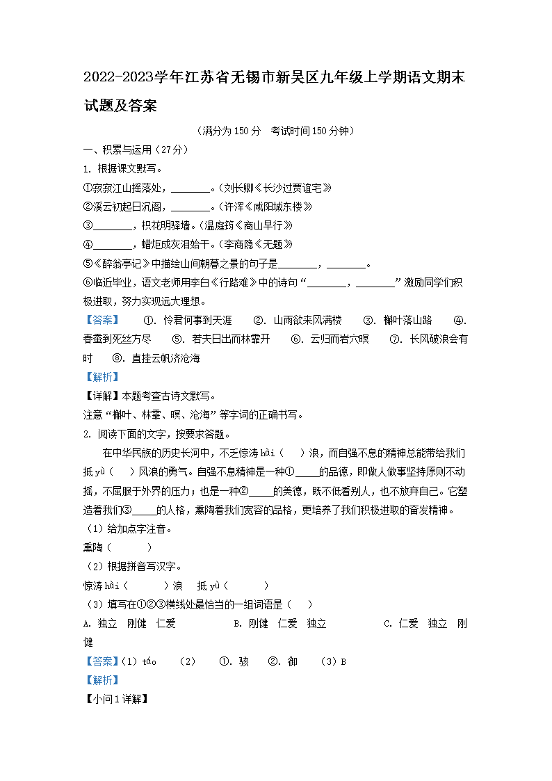 2022-2023学年江苏省无锡市新吴区九年级上学期语文期末试题及答案(Word版)09-12