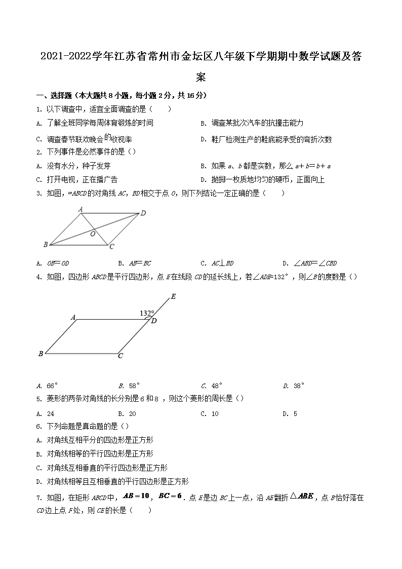 【文档预览】 文档大全网整理发布2021-2022学年江苏省常州市金坛区八年级下学期期中数学试题及答案(Word版),前五页预览如下: