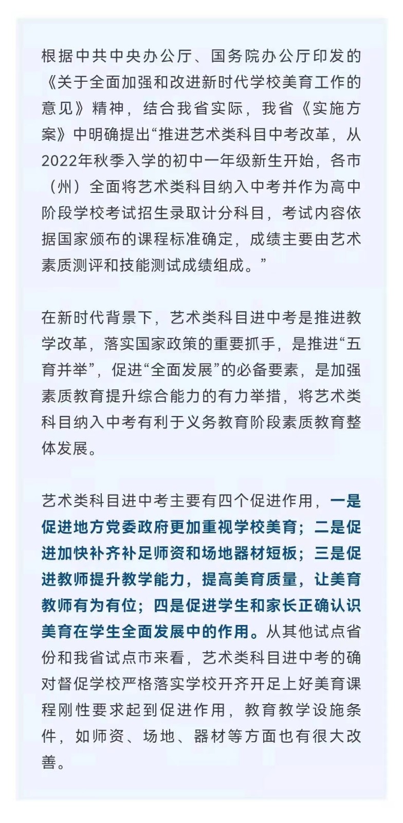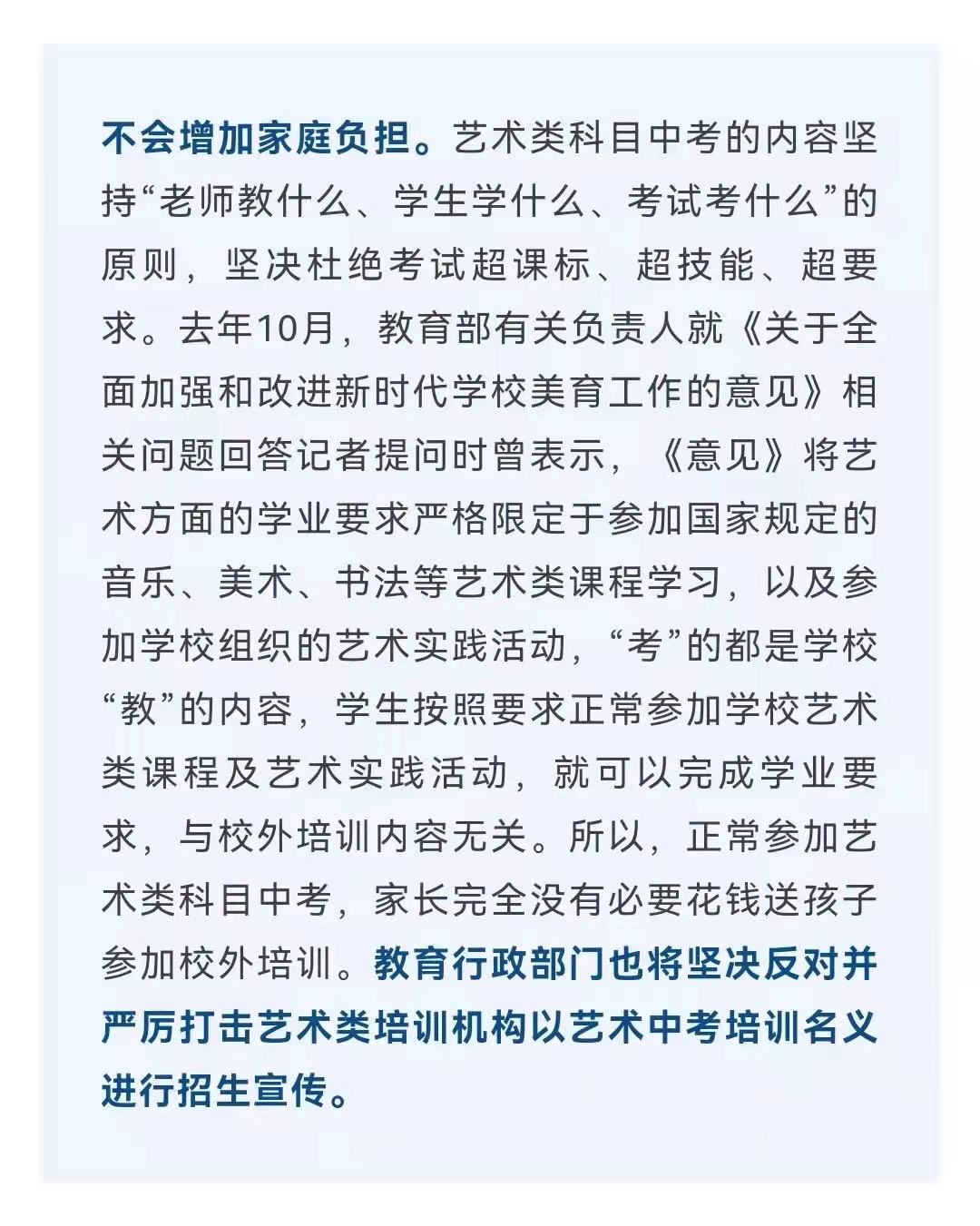 近日,中共四川省委办公厅、四川省政府办公厅印发了《关于全面加强和改进新时代学校美育工作的实施方案》,明确从2022年秋季入学的初中一年级新生开始,将艺术类科目纳入中考。消息一出,引发社会高度关注,艺术类科目进中考怎么考?考什么?对此,四川省教育厅相关负责人作出权威解读,一起来看艺术类科目进中考7问7答。