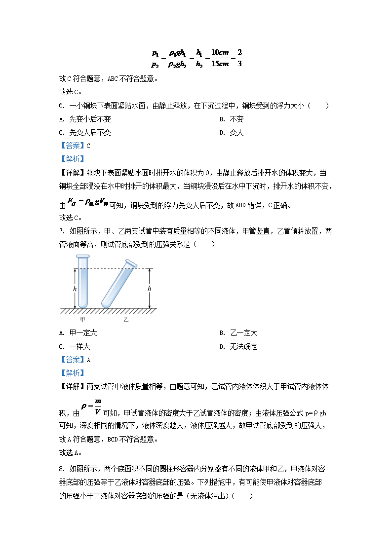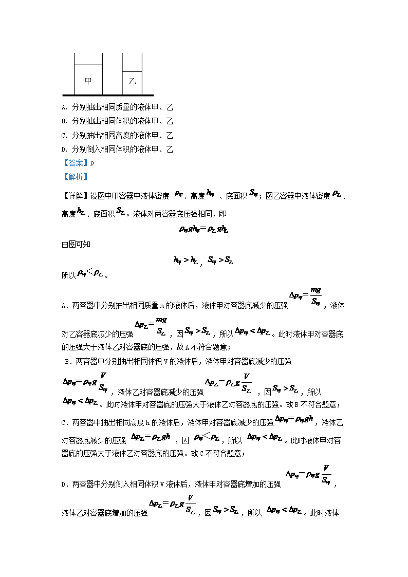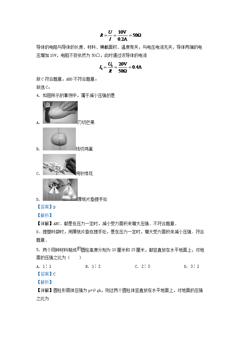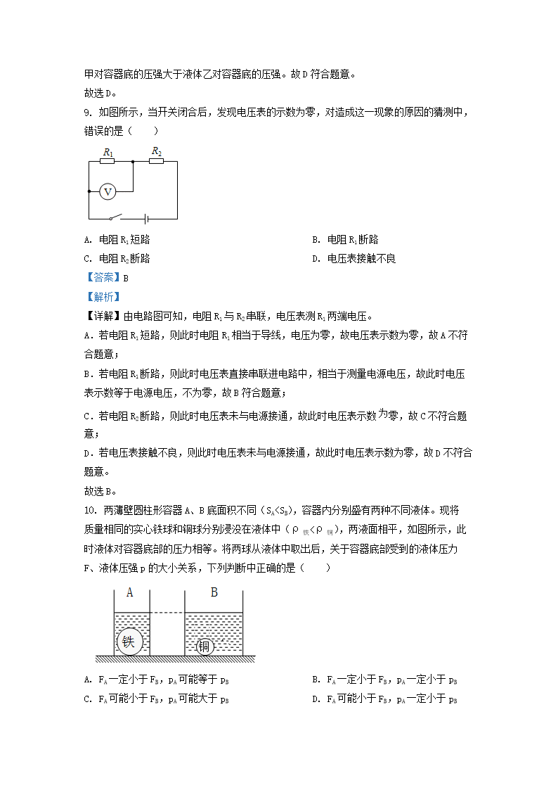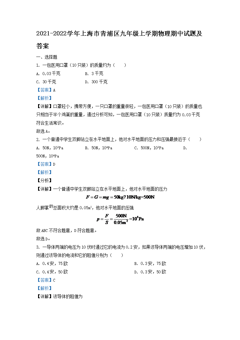 2021-2022学年上海市青浦区九年级上学期物理期中试题及答案(Word版)10-21