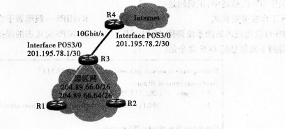 2.如下图所示,某园区网用10Gbit/s的POS技术与Internet相连,POS接口的帧格式是SONET。在R3上配置一个loopback接口,IP地址为192.167.78.6。路由协议的选择方案是,园区网内部采用OSPF动态路由协议,园区网与Internet的连接使用静态路由协议。