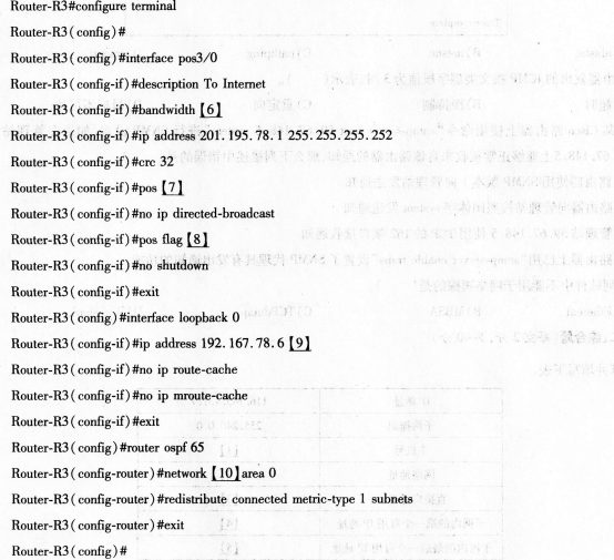【6】【解析】由bandwidth语句可知,此处应该填写的带宽,单位是kbit/s。需要注意的是,路由器中的单位转换中的k=1000,而不是1024。10Gbit/s等同于10000000kbit/s,因此【6】处应填入:10000000。