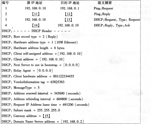 【12】【解析】由表中第一行知道,目的地址是Ping:Request的源地址,即l92.168.0.10,因此【12】处应填入:192.168.0.10。