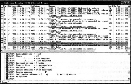 【18】【解析】本条报文是该主机向目的地址mail.tj.edu.cn发送数据包经过的一个路由器向该主机发送的封装了出错数据信息的ICMP回文,回文报告了源地址202.113.64.137到目的地址mail.tj.edu.en的链路是否畅通,故此ICMP报文信息中的源地址是该主机地址202.113.64.137,因此【18】处应填人:202.113.64.137。
