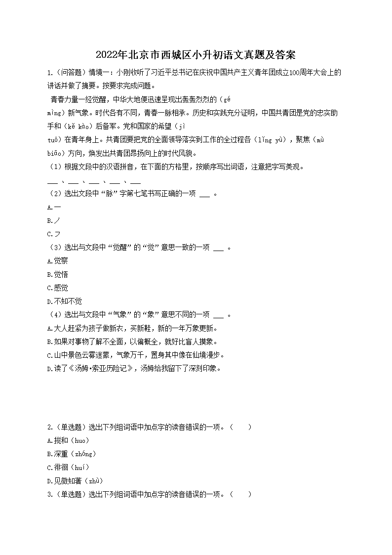 2022年北京市西城区小升初语文真题及答案(Word版)07-01