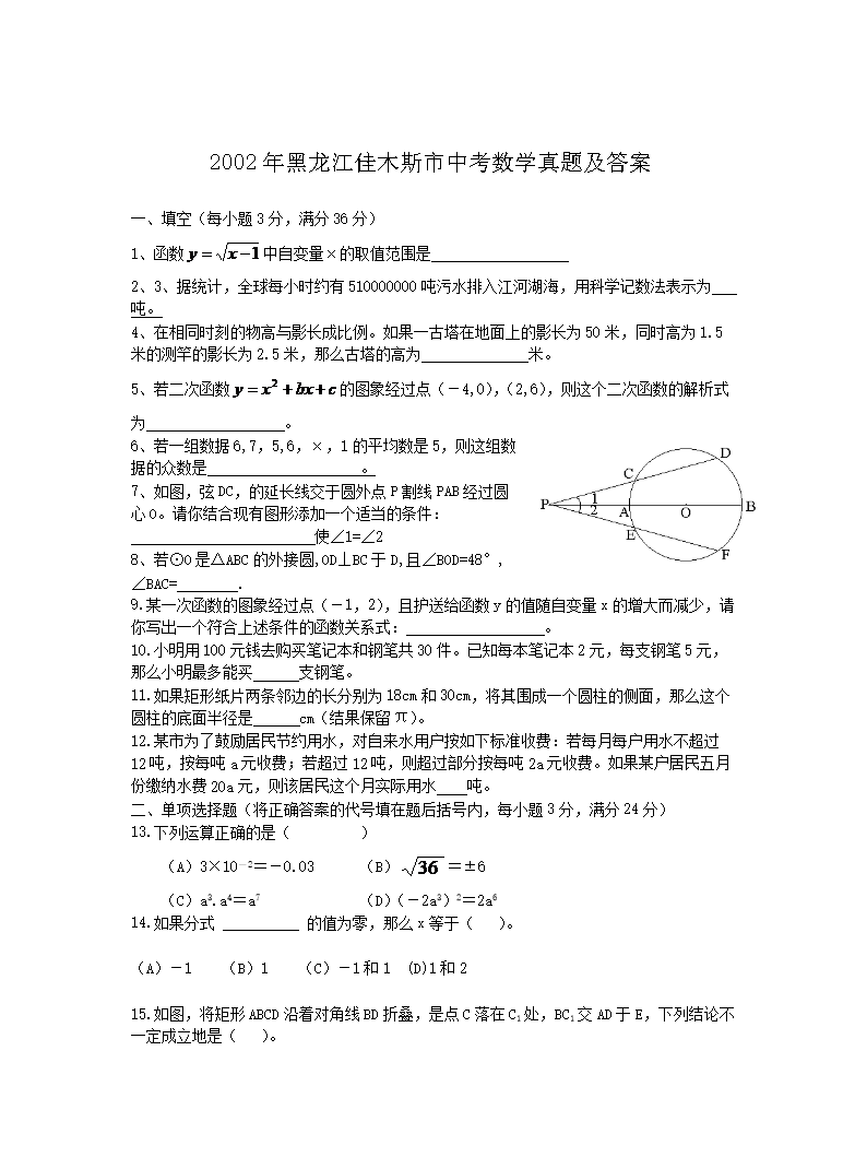 2002年黑龙江佳木斯市中考数学真题及答案(Word版)05-31