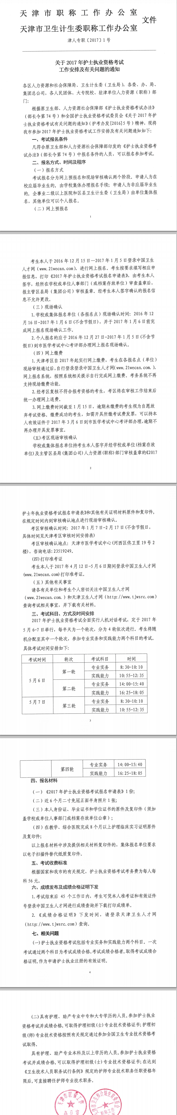 天津关于2017年护士职业资格考试工作安排及有关问题通知08-17