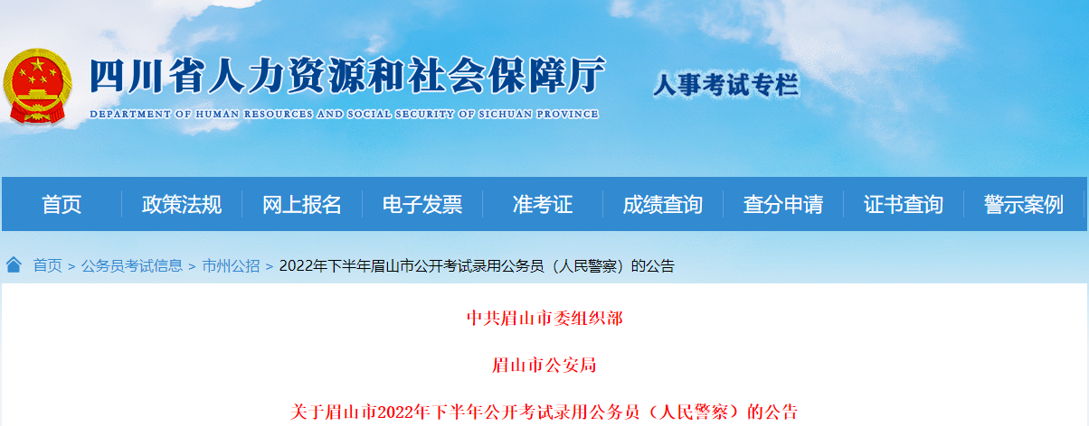 原文标题:关于眉山市2022年下半年公开考试录用公务员(人民警察)的公告