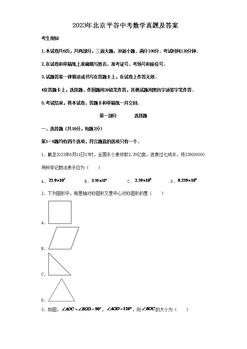 【文档预览】 文档大全网整理发布2023年北京平谷中考数学真题及答案(Word版),前五页预览如下: