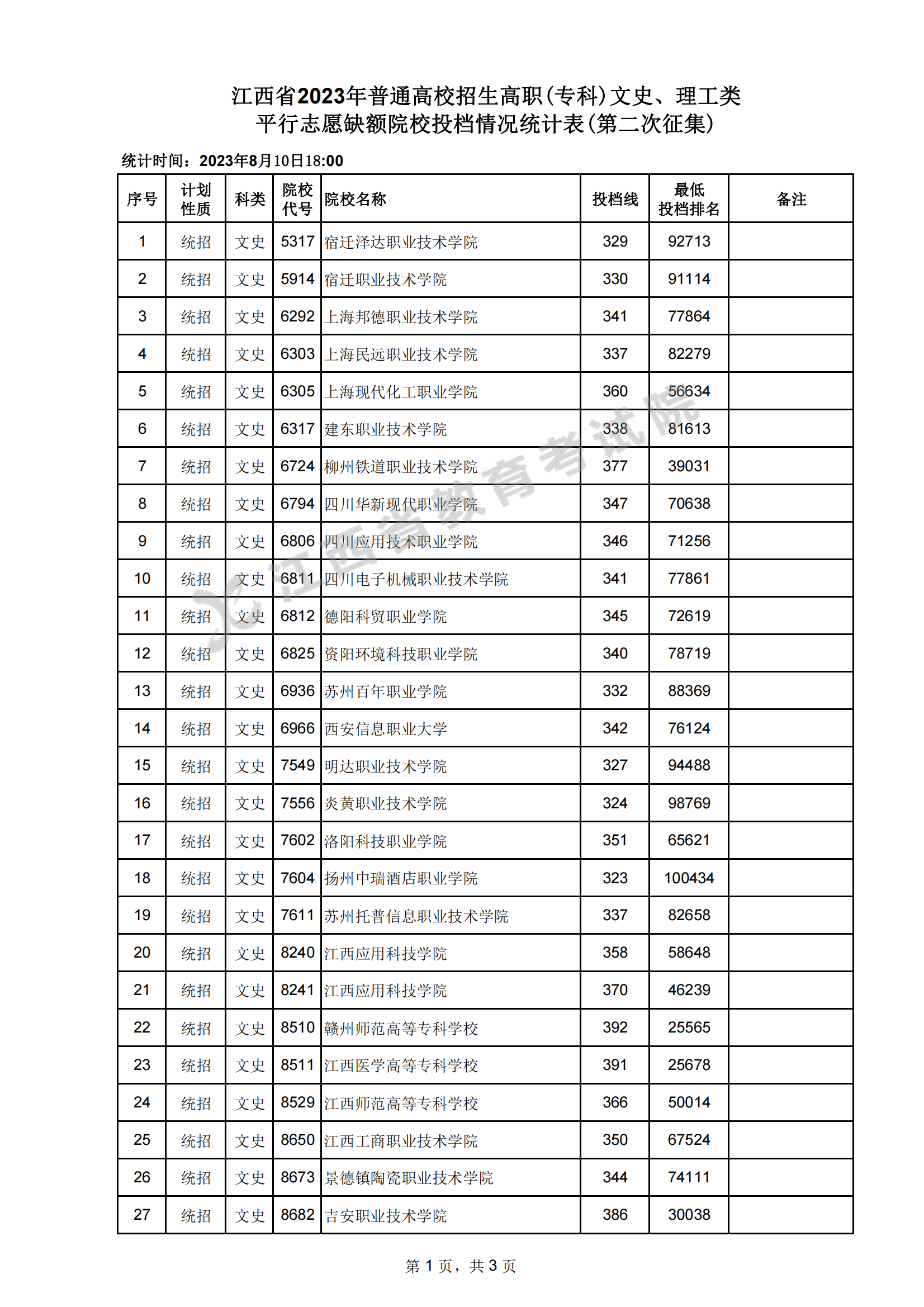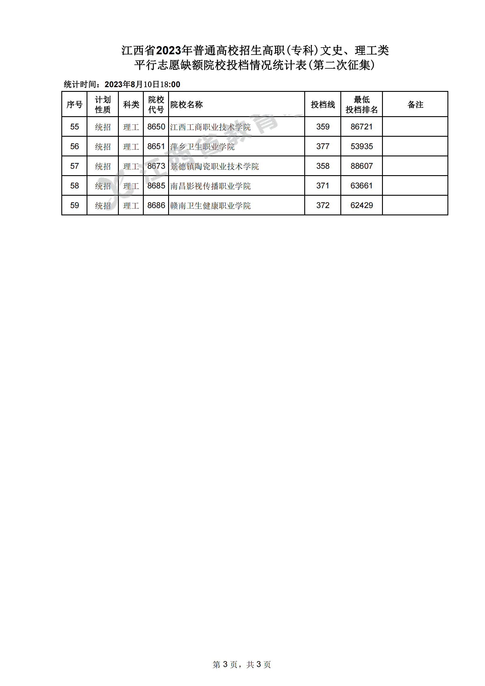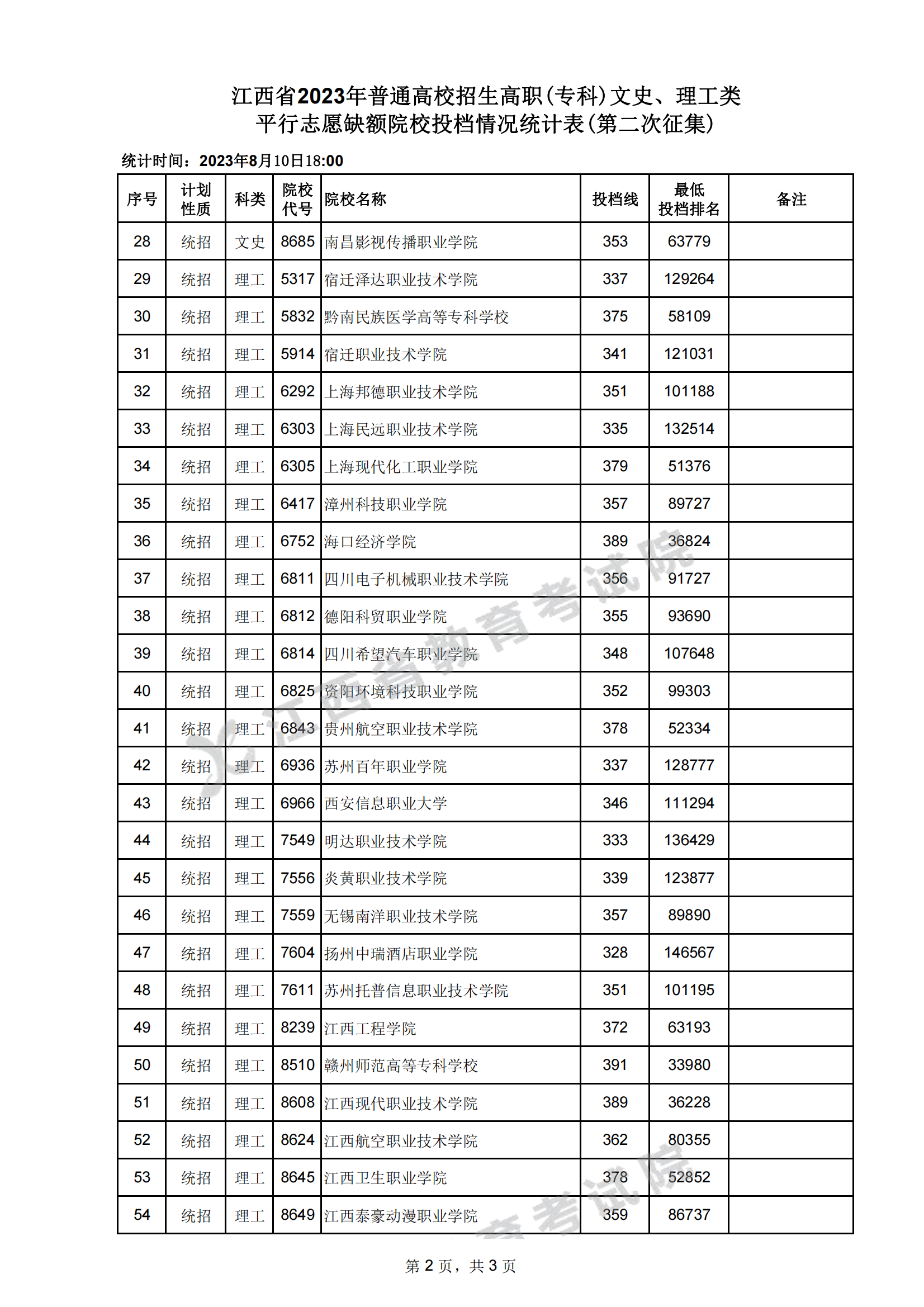 江西省2023年高职(专科)文史、理工类平行志愿缺额院校投档情况统计表(第二次征集)08-12