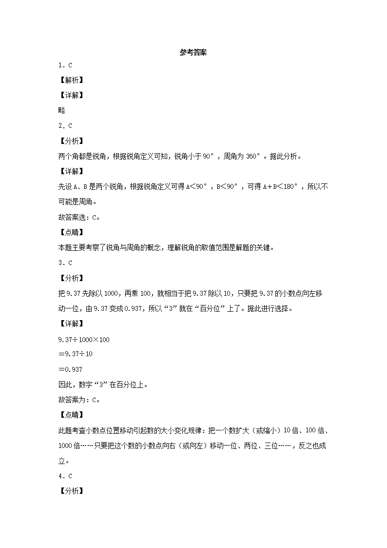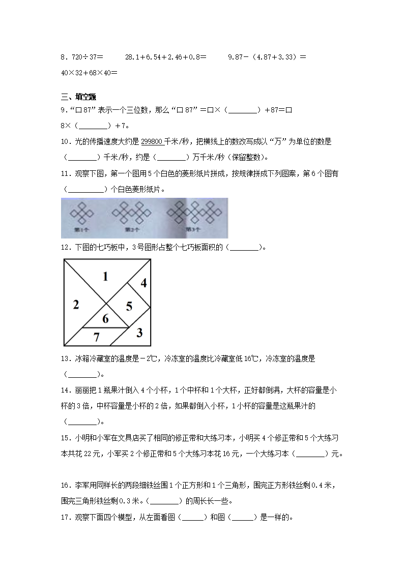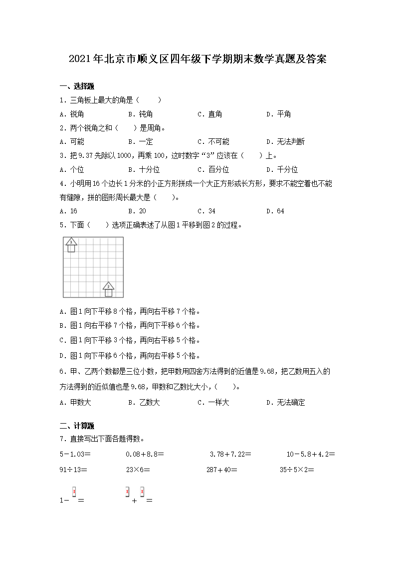 2021年北京市顺义区四年级下学期期末数学真题及答案(Word版)06-20