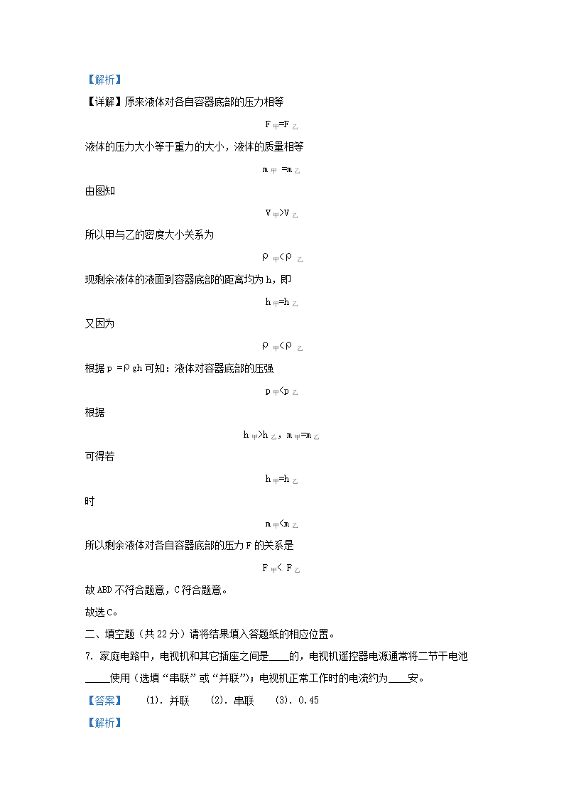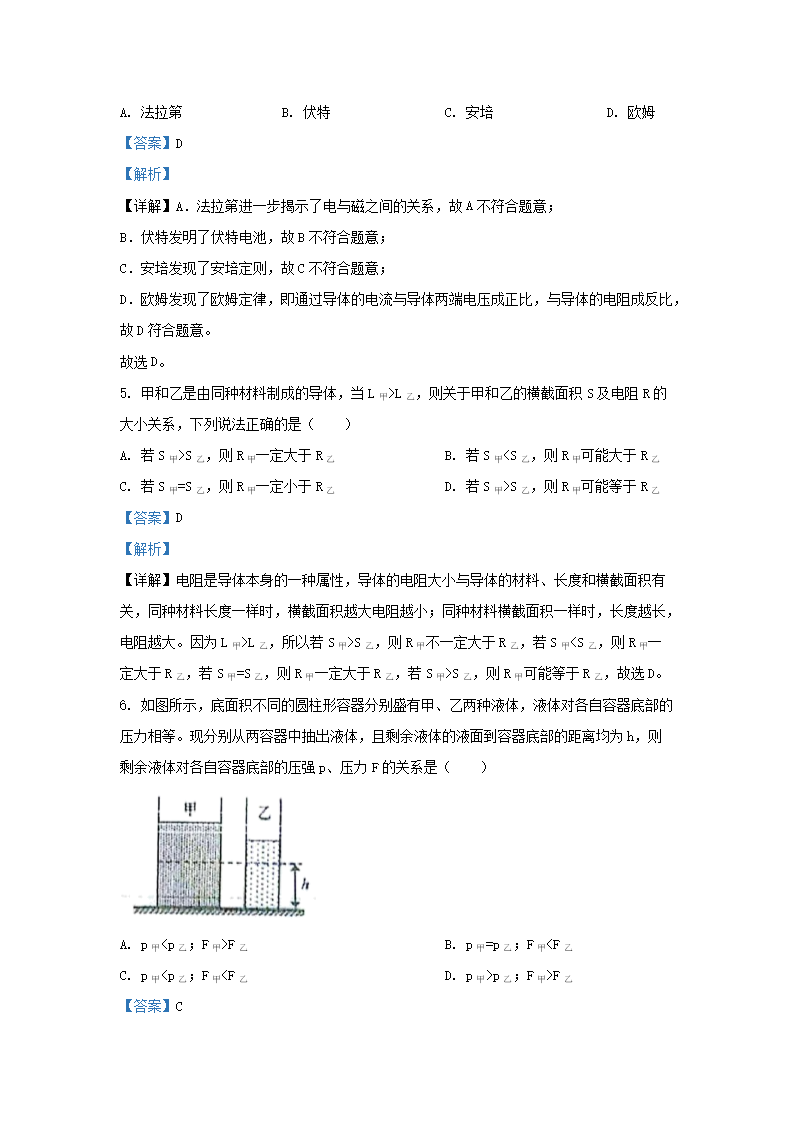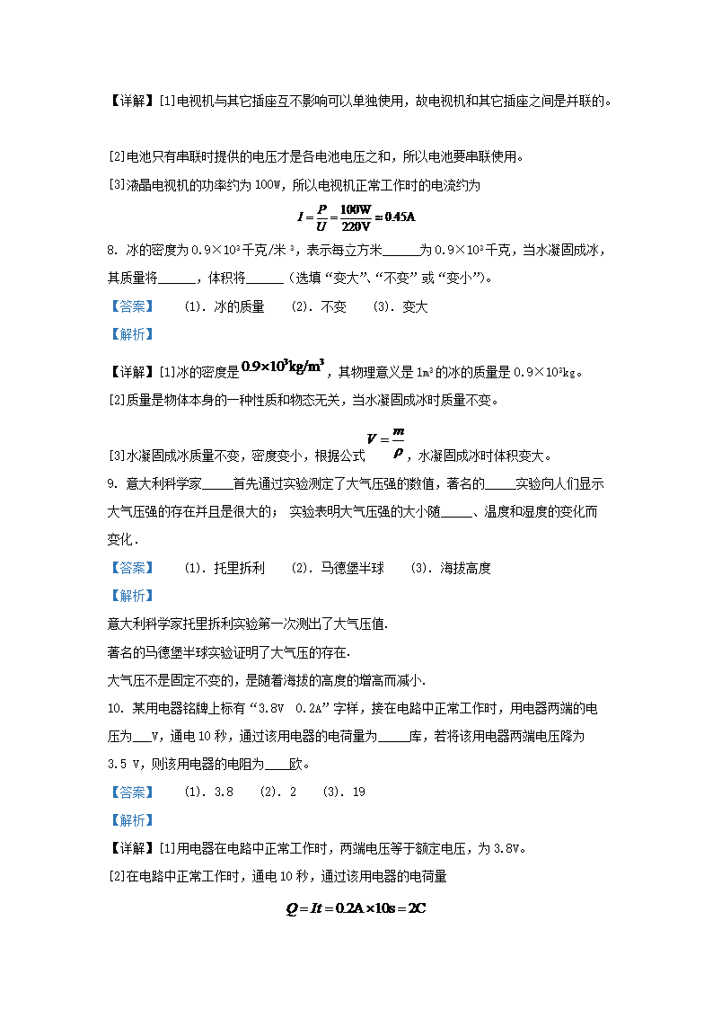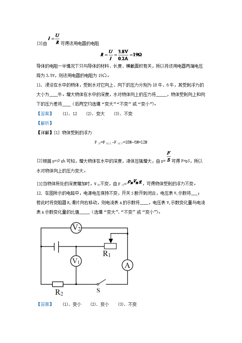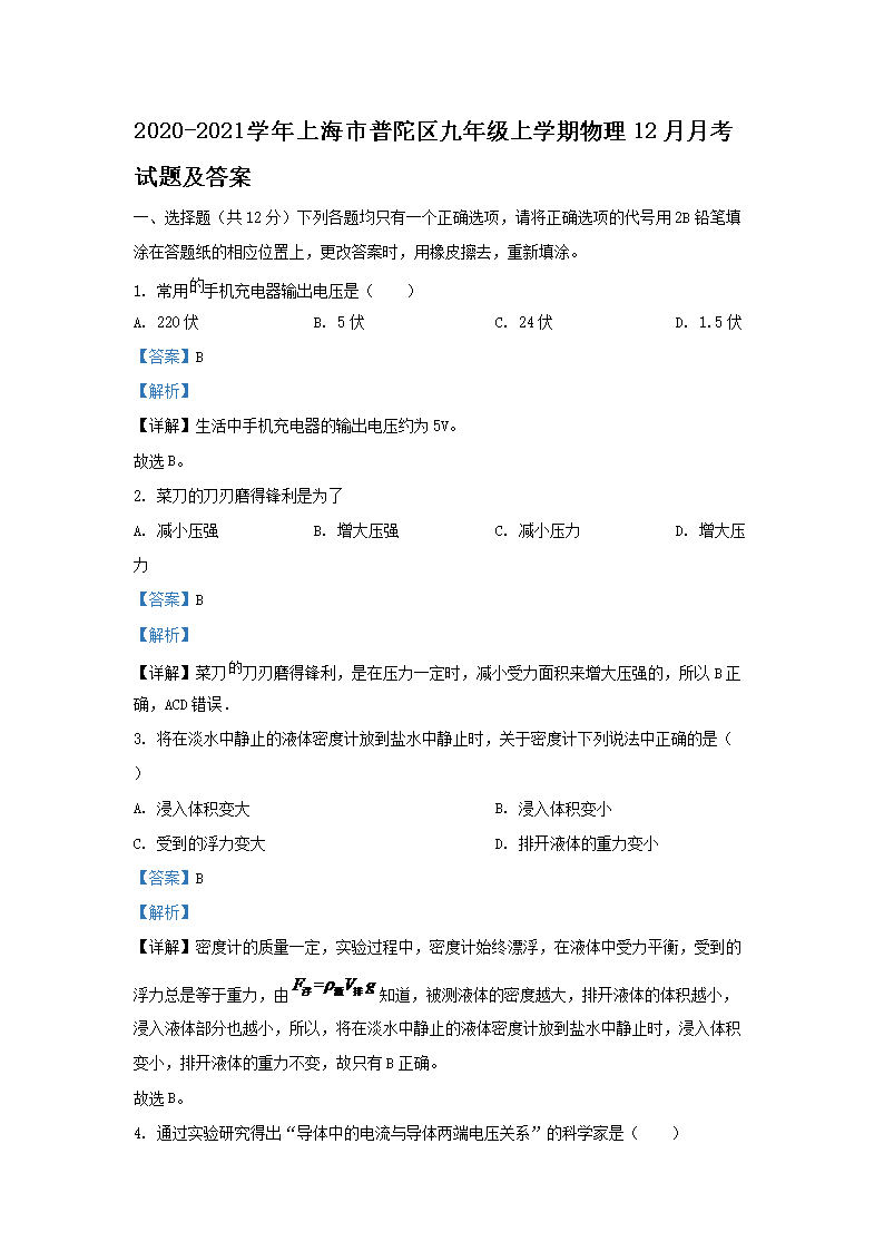 2020-2021学年上海市普陀区九年级上学期物理12月月考试题及答案(Word版)10-21