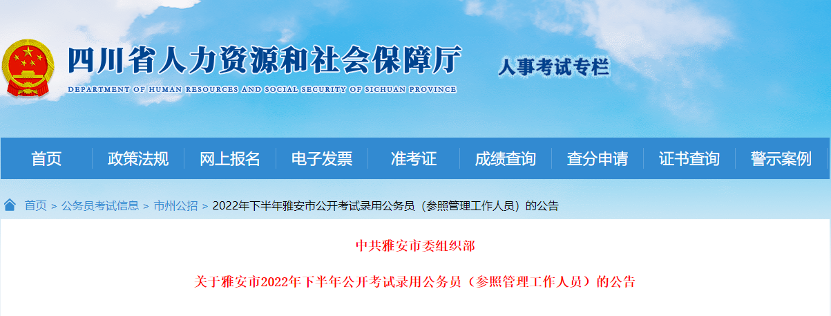 原文标题:关于雅安市2022年下半年公开考试录用公务员(参照管理工作人员)的公告