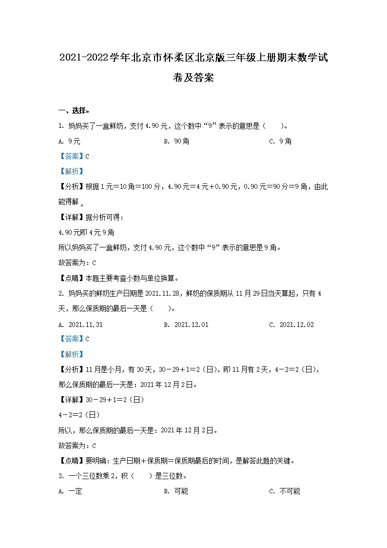 2021-2022学年北京市怀柔区北京版三年级上册期末数学试卷及答案(Word版)06-27