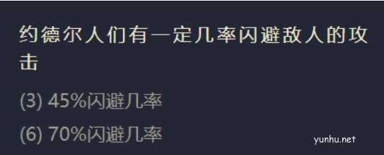 三约德尔人效果:在战斗中,有45%的闪避敌人的攻击,