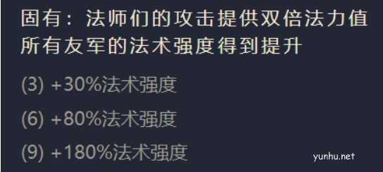 当同时拥有三个法师、六个法师、九个法师的时候羁绊效果分别为:所以法师普攻时将会获得两倍法力值,分别加30%法术强度、80%法术强度、180%法术强度。(如下图所示)