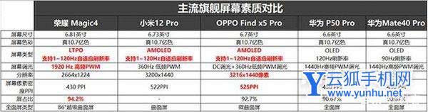 在其它屏幕规格方面,由上面多款旗舰机的参数对比可知,荣耀Magic4标准版诸如真10.7亿色、曲面屏也都安排上了,而部分消费者较为在意的分辨率与PPI像素密度,OPPO Find X5 Pro与小米12 Pro则更高一些。