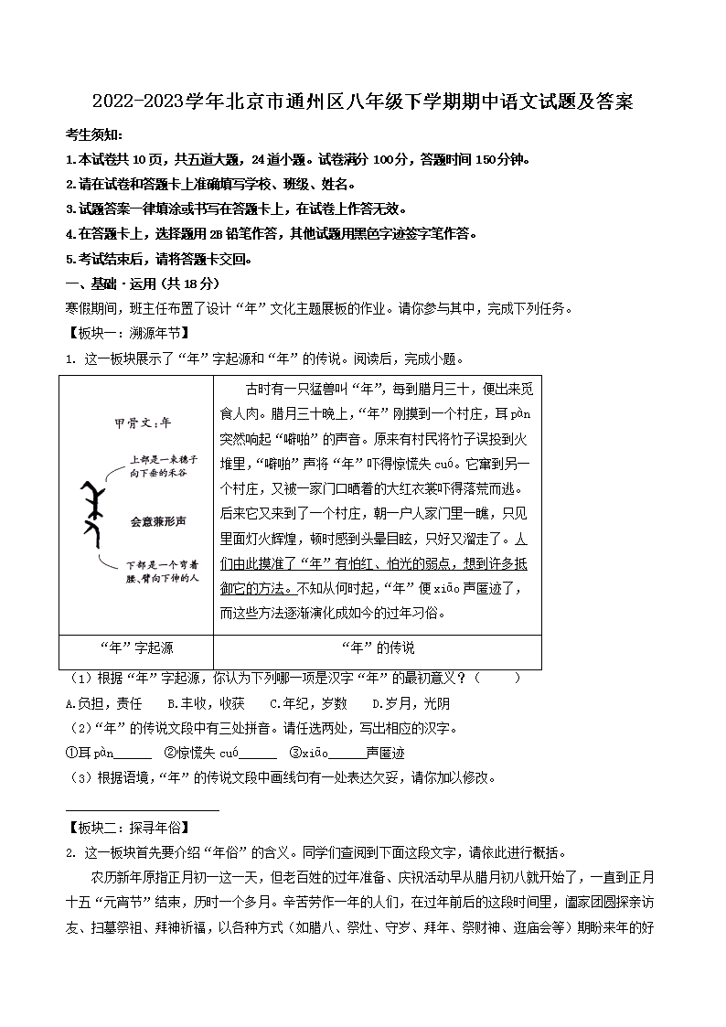 2022-2023学年北京市通州区八年级下学期期中语文试题及答案(Word版)09-28