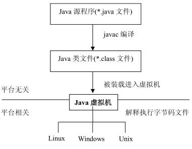 六 :Java 技术三大特性 1 :虚拟机 Java 虚拟机 JVM(Java Virtual Machine)在 Java 编程里面具有非常重要的地位,约相当于前面学到的 Java 运行环境,虚拟机的基本功能如下: (1):通过 ClassLoader 寻找和装载 class 文件 (2):解释字节码成为指令并执行,提供 class 文件的运行环境 (3):进行运行期间垃圾回收 (4):提供与硬件交互的平台 Java虚拟机是在真实机器中用软件模拟实现的一种想象机器。Java虚拟机代码被存储在 .class文件中; 每个文件都包含最多一个public类。 Java 虚拟机规范为不同的硬件平台提供了一种编译Java技术代码的规范,该规范使Java 软件独立于平台,因为编译是针对作为虚拟机的“一般机器”而做。这个“一般机器”可用软件模拟并运行于各种现存的计算机系统,也可用硬件来实现。编译器在获取Java应用程序的源代码后,将其生成字节码,它是为JVM生成的一种机器码指令。每个Java解释器,不管它是Java技术开发工具,还是可运行applets 的Web浏览器,都可执行JVM。 JVM 为下列各项做出了定义 - 指令集(相当于中央处理器[CPU] ) - 寄存器 - 类文件格式 - 栈 - 垃圾收集堆 - 存储区 JVM 的代码格式由紧缩有效的字节码构成。 由 JVM 字节码编写的程序必须保持适当的类型约束。大部分类型检查是在编译时完成。任何从属的 Java 技术解释器必须能够运行任何含有类文件的程序,这些类文件应符合 Java 虚拟机规范中所指定的类文件格式。 1.1 :虚拟机是 Java 平台无关的保障 正是因为有虚拟机这个中间层,Java 才能够实现与平台无关。 虚拟机就好比是一个 Java运行的基本平台,所有的 Java 程序都运行在虚拟机上,如下图所示: