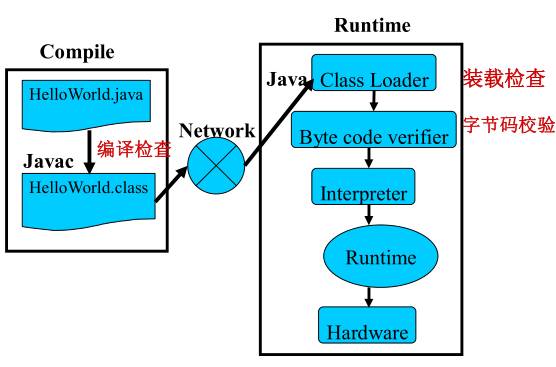 (2):第二关:通过编译关后,在类装载的时候,还会进行类装载检查,把本机上的类和网络资源类相分离,在调入类的时候进行检查,因而可以限制任何“特洛伊木马”的应用。