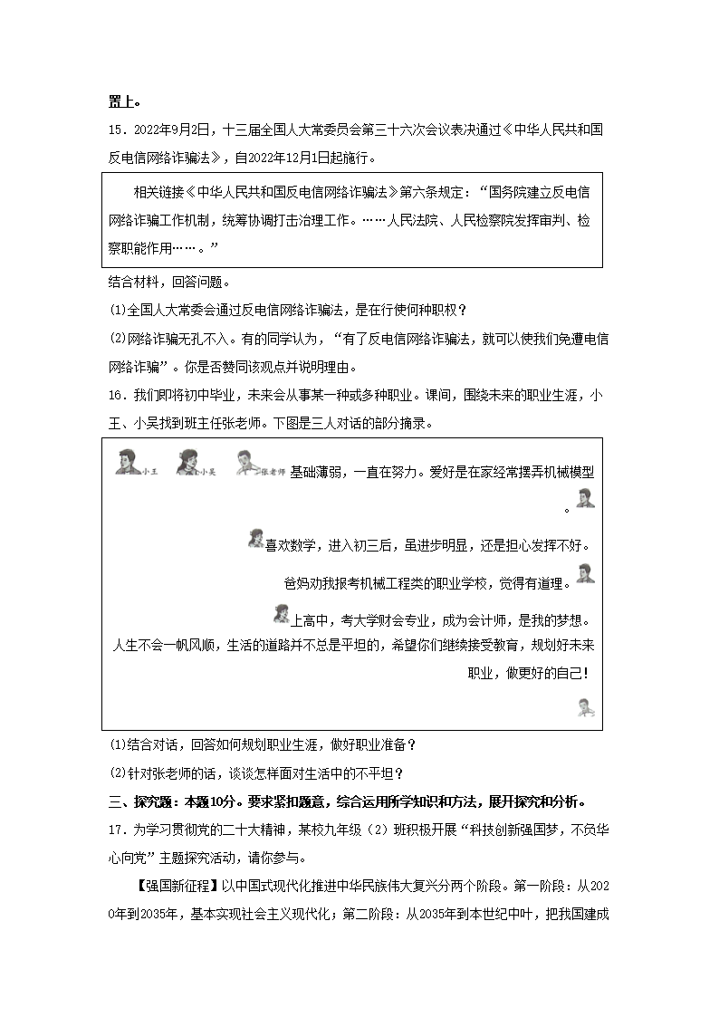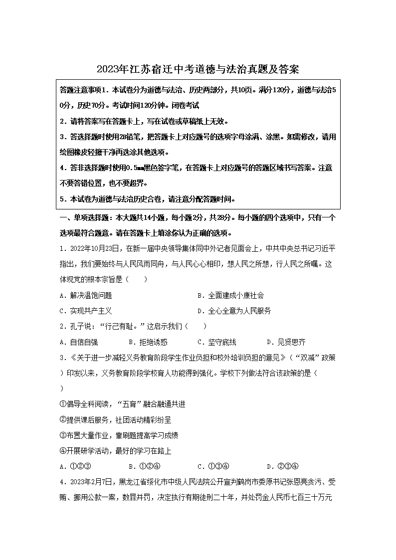 2023年江苏宿迁中考道德与法治真题及答案(Word版)10-12