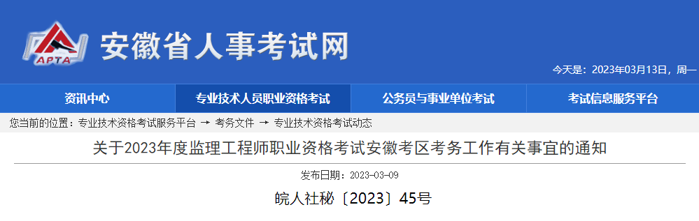 根据人力资源和社会保障部人事考试中心《关于2023年度监理工程师职业资格考试考务工作的通知》(人考中心函〔2023〕17号)精神,结合我省实际,现就2023年度监理工程师职业资格考试安徽考区考务工作有关事宜通知如下。