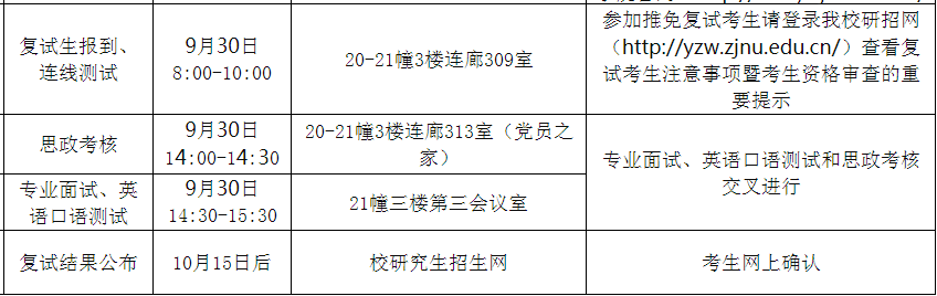 9月29日-30日:学院审核确定参加复试名单,发出复试通知,组织复试,根据学生的学术研究能力与发展潜力等方面综合考虑,给出复试成绩。复试安排具体详见日程安排。
