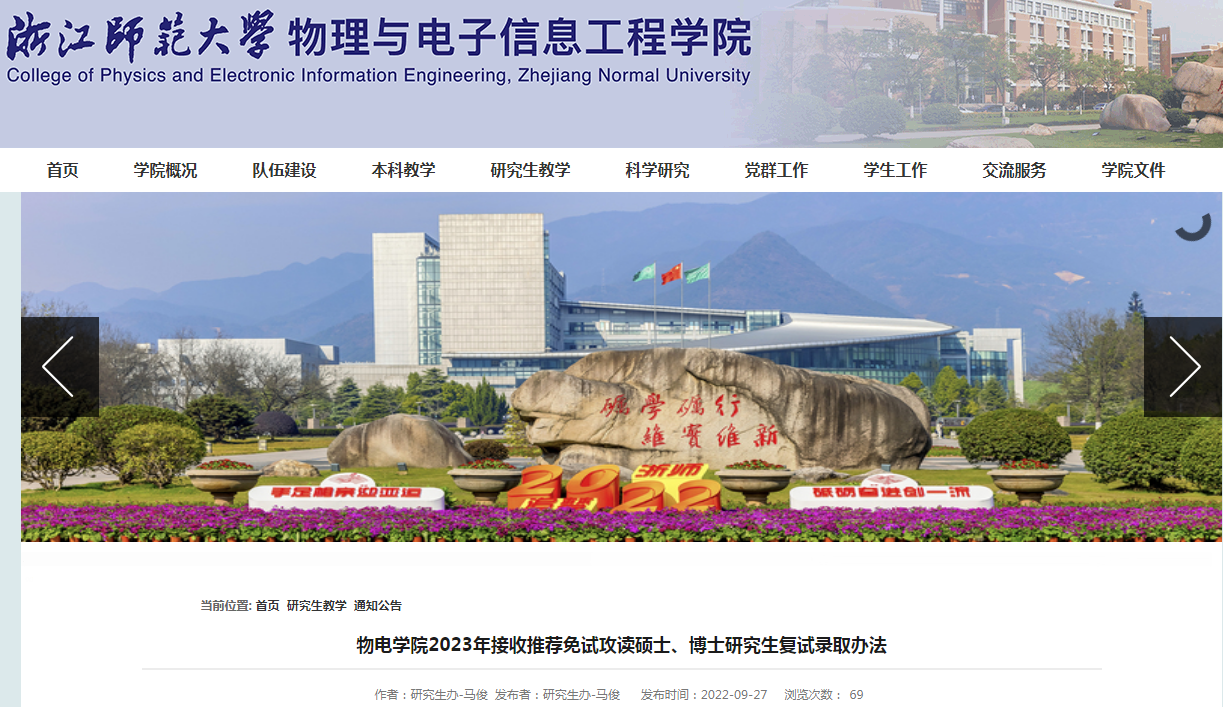 【#考研# 导语】®文档大全网考研频道从浙江师范大学物理与电子信息工程学院了解到,浙江师范大学物理与电子信息工程学院2023年接收推荐免试攻读硕士、博士研究生复试录取办法已公布,详情如下: