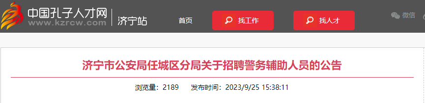 【#招警考试# #2023年山东济宁公安局任城区分局招聘警务辅助人员公告(30名)#】©文档大全网从孔子人才网获悉,2023年山东济宁公安局任城区分局招聘警务辅助人员30名。报名时间:9月25日-10月7日,更多事宜请参考阅读《招聘公告》,官方公告原文如下: