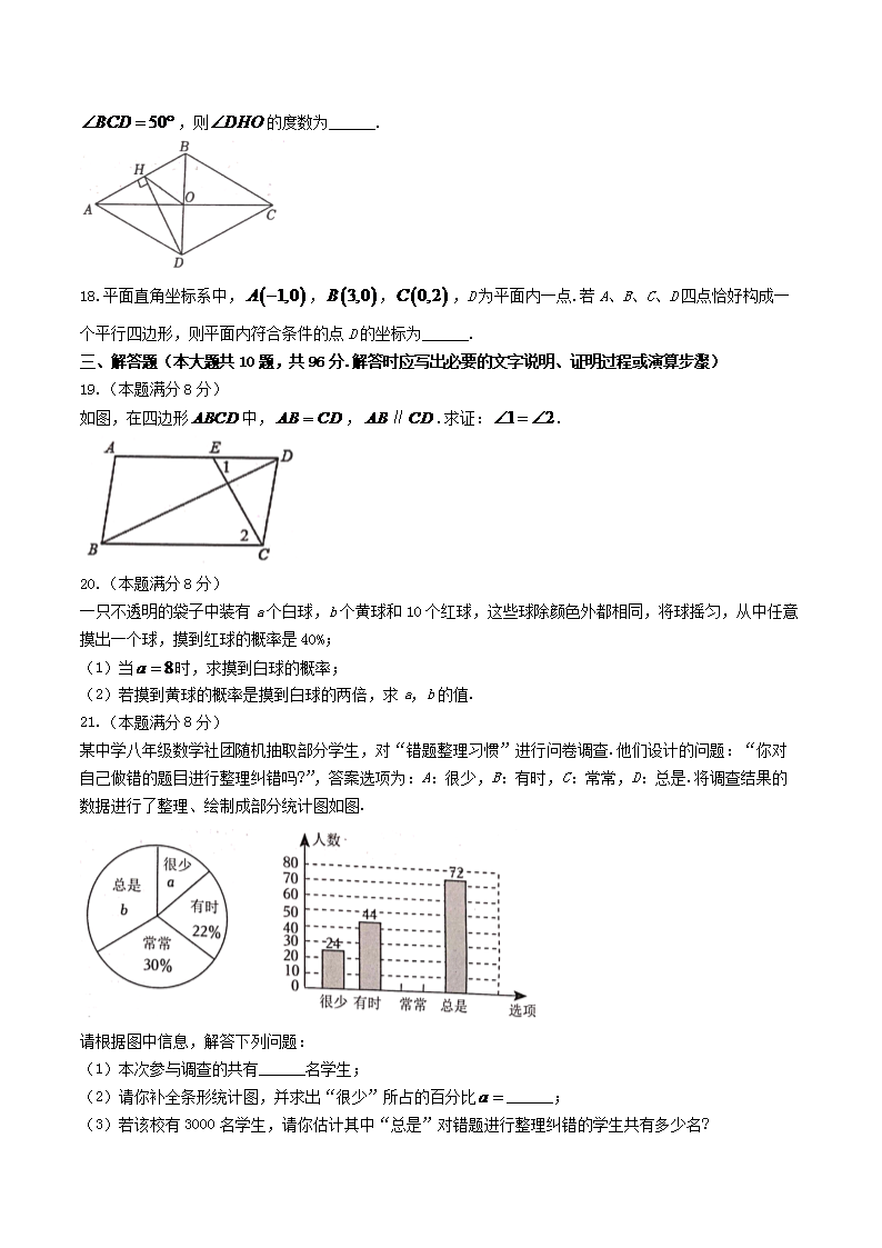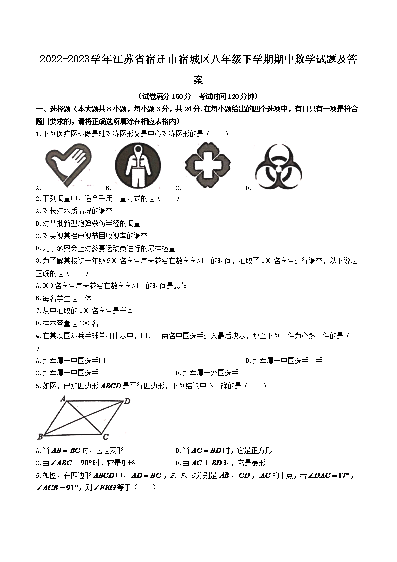 2022-2023学年江苏省宿迁市宿城区八年级下学期期中数学试题及答案(Word版)10-12