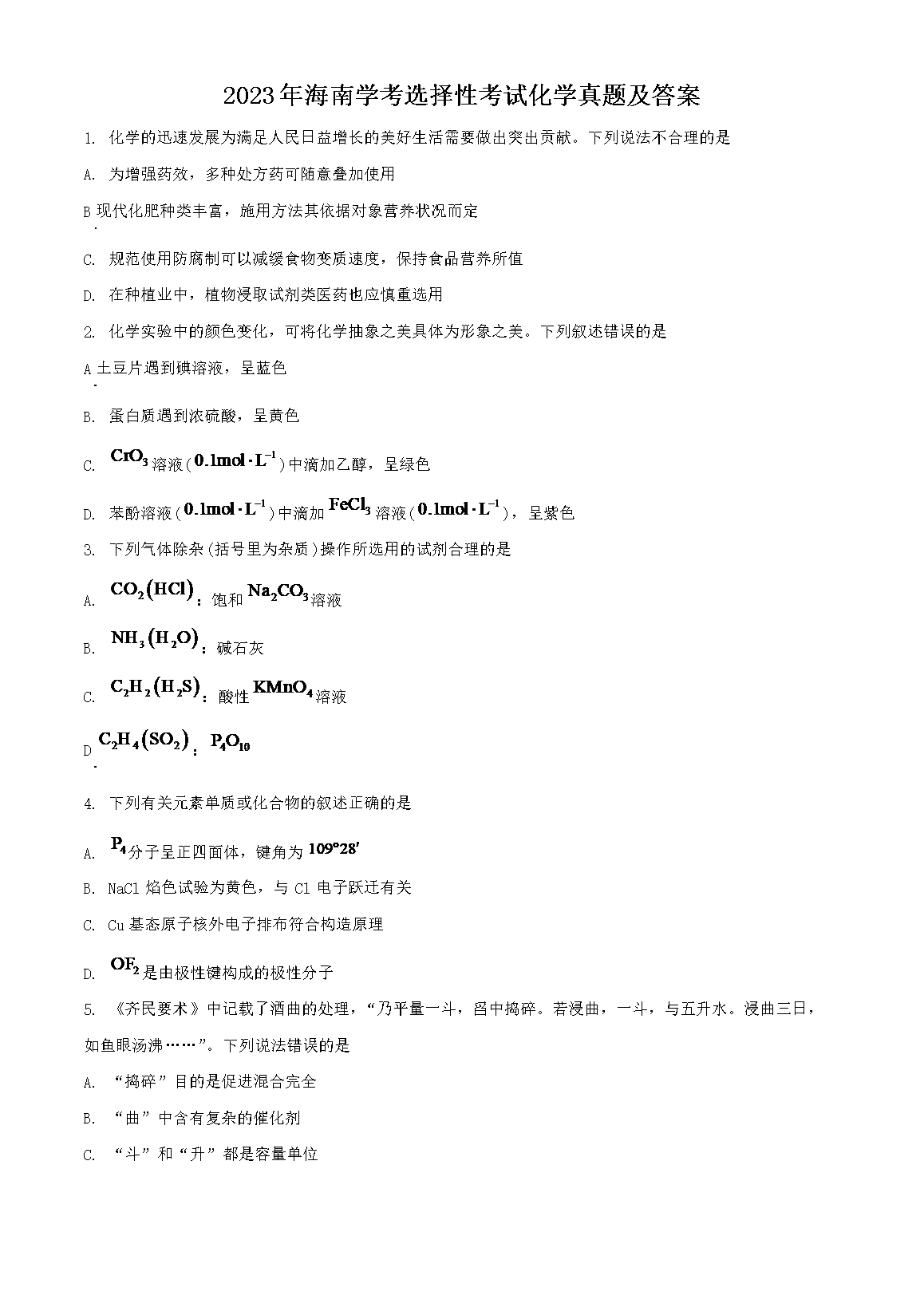 【文档预览】 文档大全网整理发布2023年海南学考选择性考试化学真题及答案(Word版),前五页预览如下: